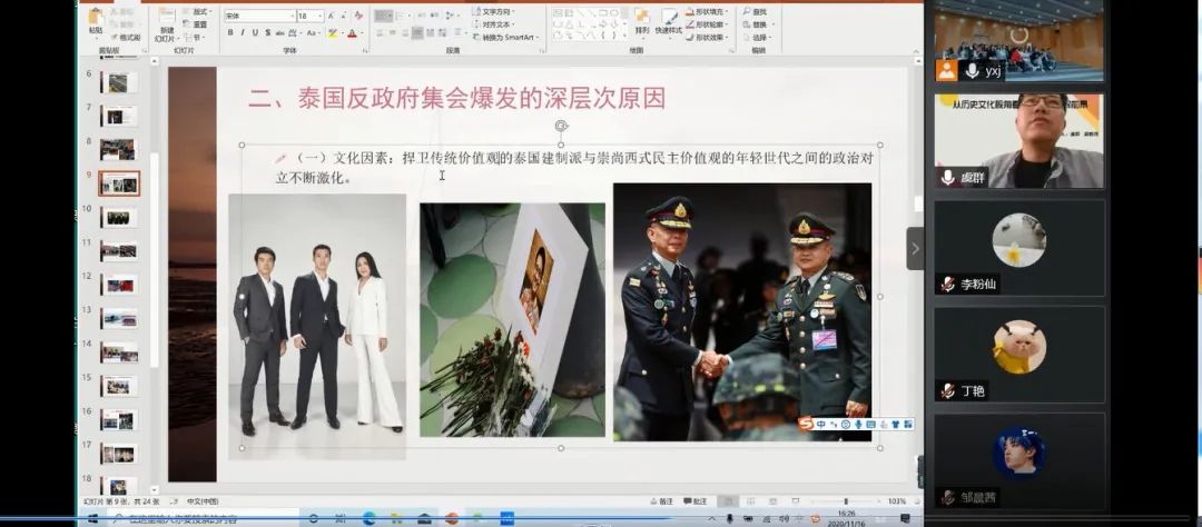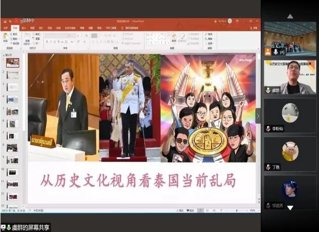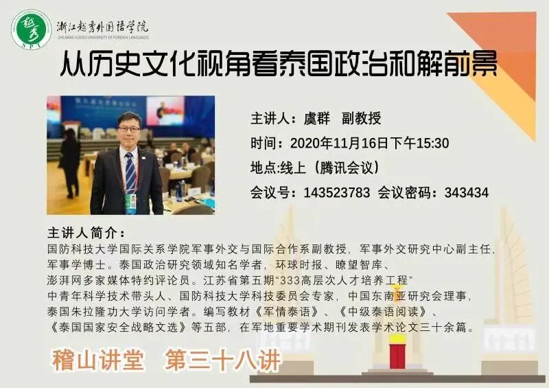 2020年11月16日下午三点半,浙江越秀外国语学院东方语言学院泰语系举办了以“从历史文化视角看泰国政治和解前景”为主题的线上学术报告,本次会议有幸邀请到国防科技大学国际关系学院军事外交与国际合作系副教授、军事学博士、泰国政治研究领域著名学者虞群作为主讲人,会议由泰语系主任易朝晖教授担任主持,泰语系全体师生统一线下参与聆听。