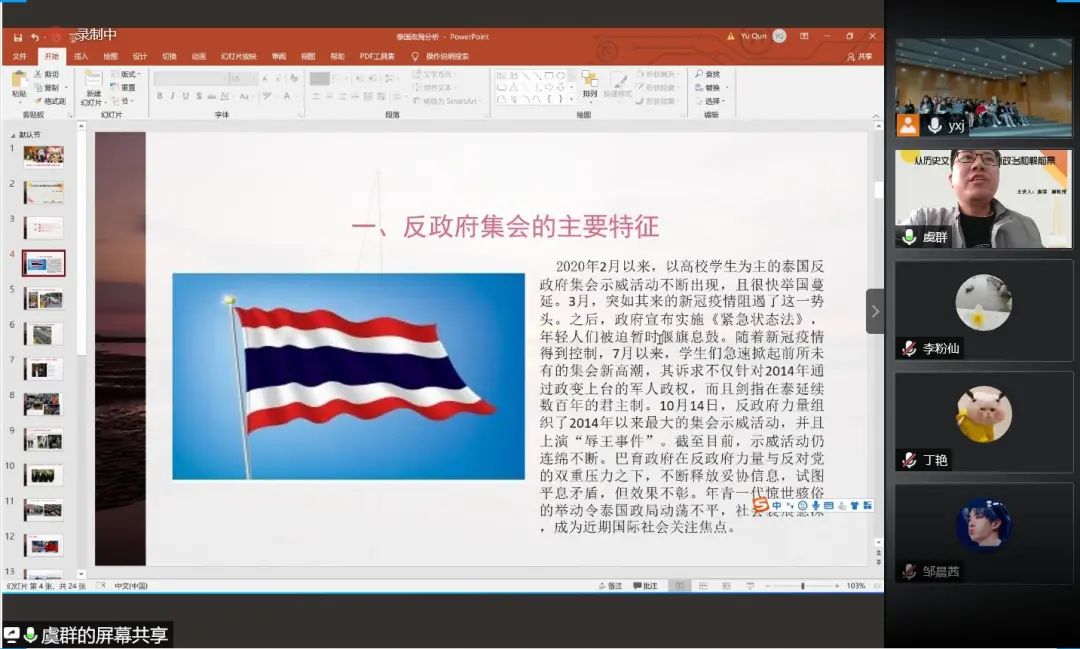 讲座伊始,虞老师以近日备受国际关注的泰国乱局为切入点,通过回顾2020年2月以来,泰国反政府示威活动的群众矛盾与冲突、矛盾缓和与再爆发的过程,深入浅出地讲解了反政府集会的三大主要特征,即“政治诉求鲜明”、“参与主体广泛”和“组织严密行动专业”。