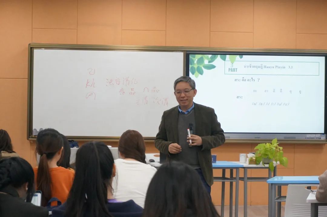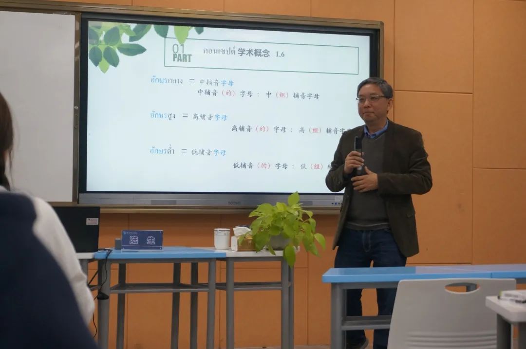 4月9日下午一点半,以“泰语语音文字系统阐释”为主题的学术讲座在F149智慧教室开展。本次会议特别邀请了云南民族大学南亚东南亚语言文化学院院长、教育部高等学校外国语言文学类专业教学指导委员会委员、非通用语种类专业教学指导分委员会副主任委员陆生教授作为主讲人,由泰语系主任易朝晖教授主持,泰语系全体师生均到现场聆听了此次讲座。