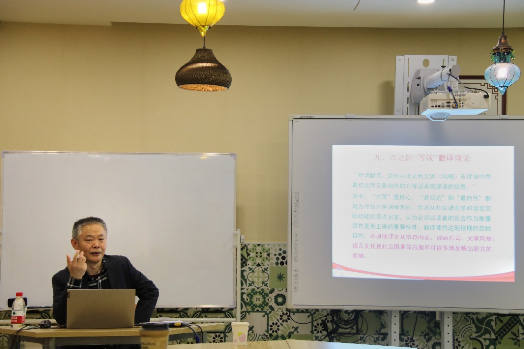 讲座开始之后,首先探讨了 “翻译标准问题”。沈教授主要介绍了道安的“五失本三不易”、玄奘的“五不翻”、赞宁的译经“六例”、马建忠的“善译”、严复的“信达雅”、傅雷的“形似、神似”说、钱钟书的“化境”说、许渊冲先生从诗学的视角提出的“意美、形美、音美” 翻译标准以及奈达提出的等效翻译理论和泰特勒提出的三条翻译原则等翻译标准理论,然后结合了《穆斯塔法·凯末尔传》的土耳其语汉语翻译的具体实践,讲解了相关翻译标准理论的具体应用。沈教授引导大家感受了翻译作品逻辑的严谨性与语言的优美性,以及中文文化差异导致的语言习惯的不同,令同学们受益匪浅。