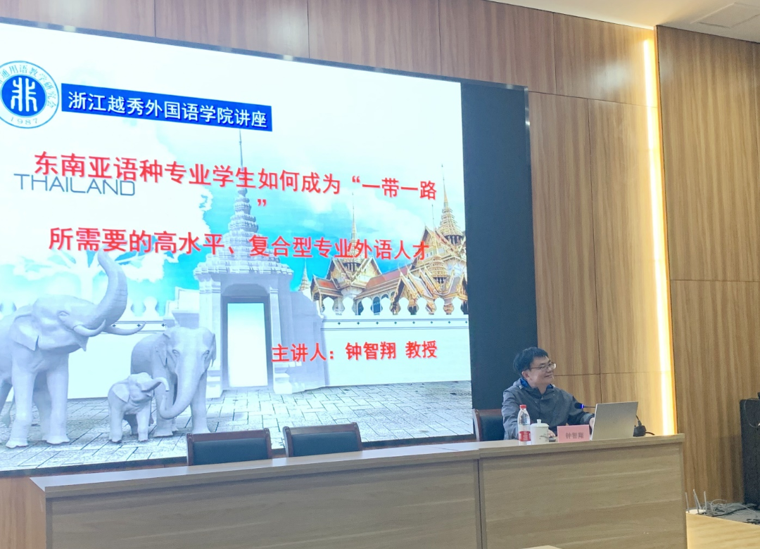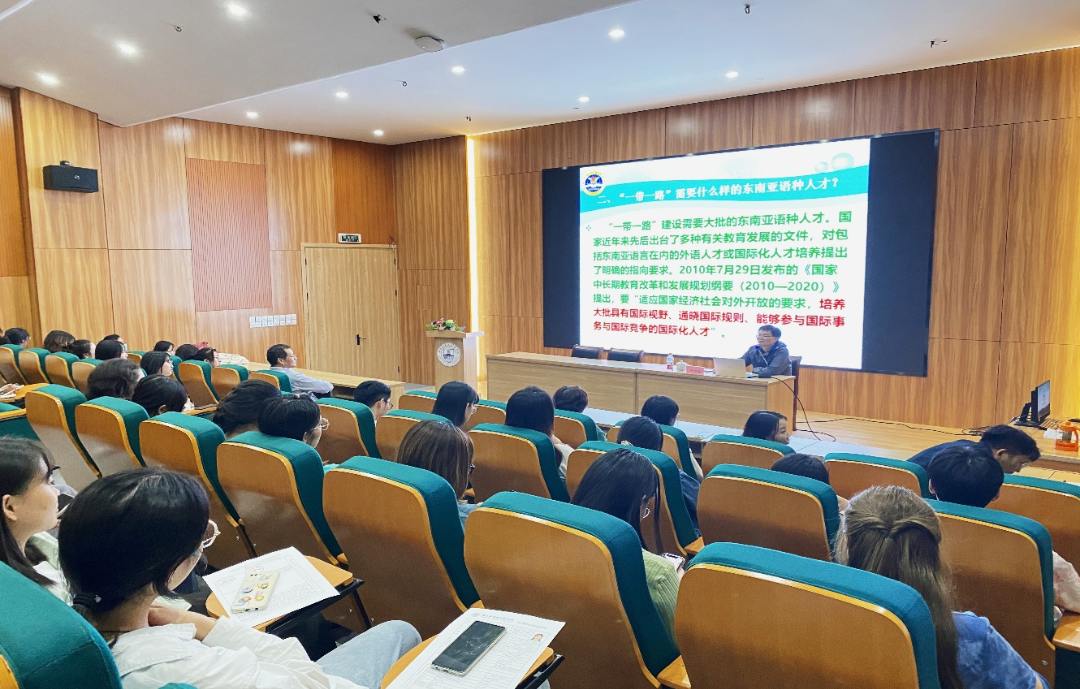 本次讲座由泰语专业负责人易朝晖教授主持,泰语系和印尼语系全体师生均到现场聆听了此次讲座,现场座无虚席。钟教授以“一带一路”为切入点,向同学们解读了国家乃至国际发展的大势,并深度剖析了“一带一路”政策为东南亚语种专业学生带来的发展机遇,同时,钟教授通过解读相关国家政策、结合国家机关、企业招聘非通用语人才的相关要求,指出了在精通外语的同时,更要懂专业、通技术,并通过多个案例深入浅出地向同学们指明了非通用语专业学生该如何构建专业知识体系以抓住时代机遇。