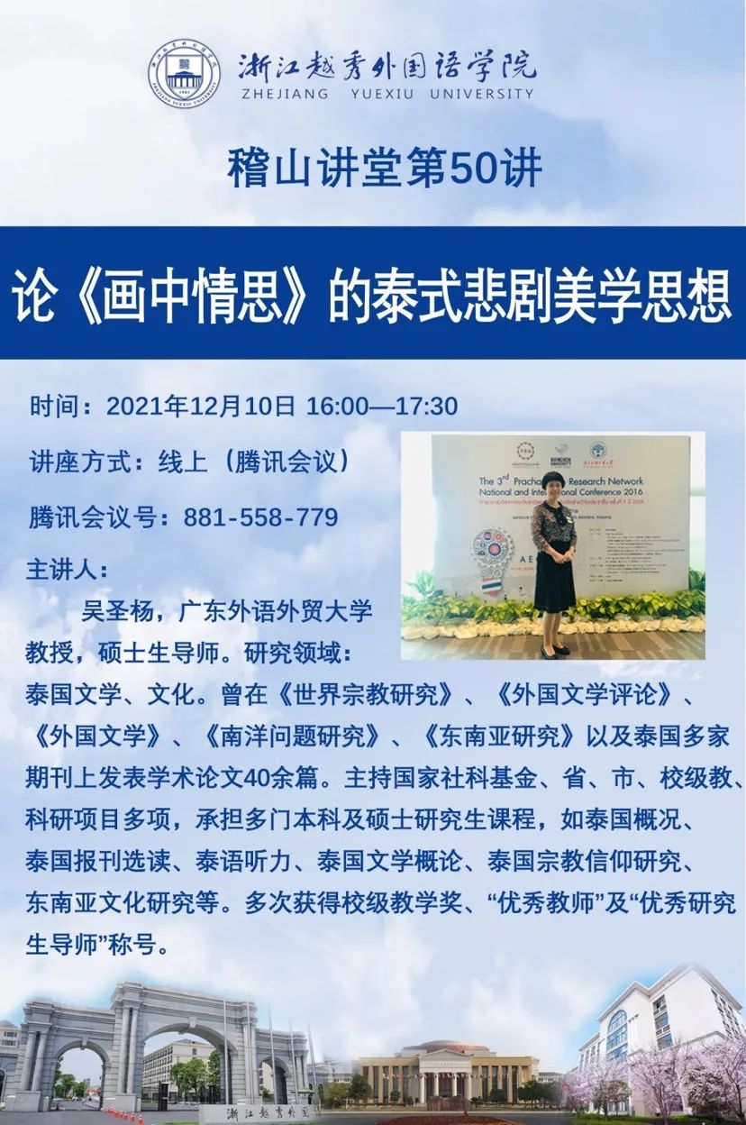 12月10日16时,东方语言学院泰语系在线上举行了以“论《画中情思》的泰式悲剧美学思想”为主题的学术讲座。本次活动特邀了广东外语外贸大学吴圣杨教授为主讲老师,东语学院副院长易朝晖教授主持,泰语系师生及部分其他高校的师生参加了本次活动。