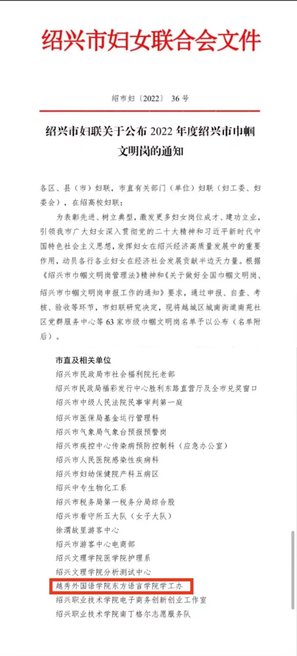近日,绍兴市妇女联合会公布2022年度绍兴市巾帼文明岗名单,浙江越秀外国语学院东方语言学院学工办荣获绍兴市巾帼文明岗称号。