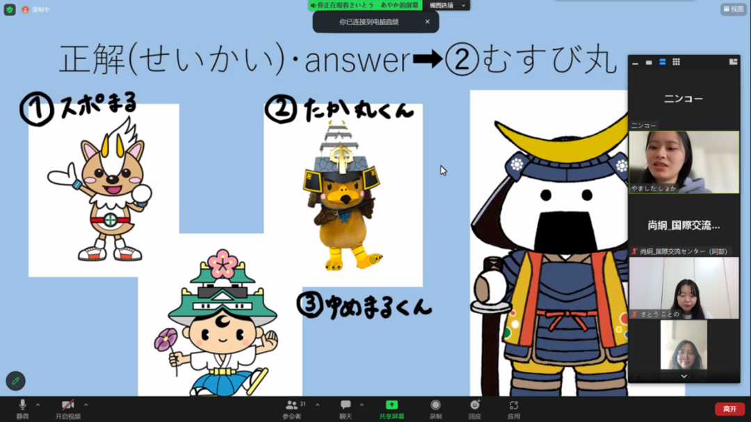 整体来说我认为这次活动还是非常不错的,前半段时间分享了尚炯学院的特色还有日本地方的有趣事物,非常新奇。而后的交流环节也非常有趣,大家都非常活跃与友好。
