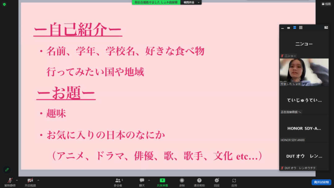 虽然刚学习日语不久,但稍显薄弱的词汇量也可以让我与一海之隔的朋友们交流喜欢的音乐与作品。作为一年级的学生,小组形式让我有了可以求助的人,学姐的帮忙活跃了现场的气氛。希望下次还可以参加这样的活动。