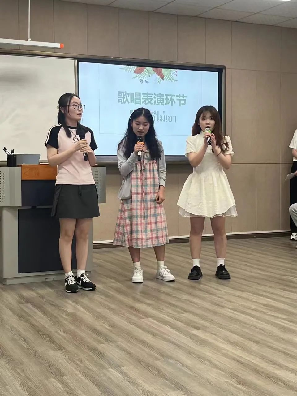 中泰学生都为此次交流活动准备了精彩的歌舞表演节目和互动游戏。首先,泰语2201班的朱怡琳、孙晶晶和赵天悦三位同学演唱泰语歌曲 《ไม่ได้ก็ไม่เอา》,接着泰语2001班的吴雨轩同学表演舞蹈串烧,同学们甜美的歌声和优美的舞姿给活动现场的每一个人带来了欢乐。