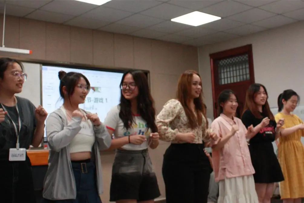 紧接着,泰国留学生们给大家带来了有趣的泰语歌曲《烤鸡歌》,并进行了现场舞蹈教学,带动了全场气氛,同学们都被泰国朋友们的热情所感染,一起跟着跳起了这首歌曲。互动环节,中泰学生分别带来了背对背猜词和传声筒等轻松有趣的小游戏,在游戏中同学们收获了很多泰语语言文化小知识。