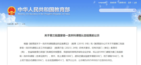 据悉,本次教育部公布第三批国家级一流本科课程名单,共有5999门课程入选,其中,线上课程1000门,虚拟仿真实验教学课程500门,线下课程1842门,线上线下混合式课程2206门,社会实践课程451门。全国共25个省份154所民办高校的234门课程入选第三批国家级一流本科课程,其中,浙江省共7校9门课程入选公示名单。