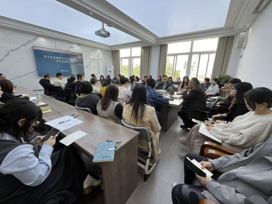 首先,由邱鸣院长做题为“关于东北亚研究中心团队建设的几点思考”的主旨发言,系统阐述了智库建设的意义与研究方向,智库建设与学科专业建设、青年教师成长之间的关联。邱院长指出,东北亚研究中心是学校首个省部级科研平台,其与学院的一体化建设,为学科及专业发展提供了良好契机,也为青年教师个人成长开辟了新空间。智库建设将重点聚焦三个方向:①“浙江与东北亚经贸关系研究”、②“浙江东北亚区域国际传播效能研究”、③“东北亚变局与浙江‘一带一路’参与研究”。邱院长强调,智库建设将与学院的学科及专业建设形成良性互动,助力学院实现高质量发展。面对国际环境和人工智能带来的严峻挑战,外语类专业正迎来转型关键期,学院将依托省级智库平台,结合东北亚、东南亚和中东三个区域来统筹教学与科研,积极推进“区域国别学专业”和“区域国别学硕士点”的申报工作。此外,区域国别学的交叉特性,可以使青年教师们能够在该领域中找到研究契合点,在开展智库专题研究的同时,教师们也能不断深化对区域国别学整体的理解和把握,实现科研和教学能力的双提升,从而推动课程建设、学科及专业建设的协同发展。