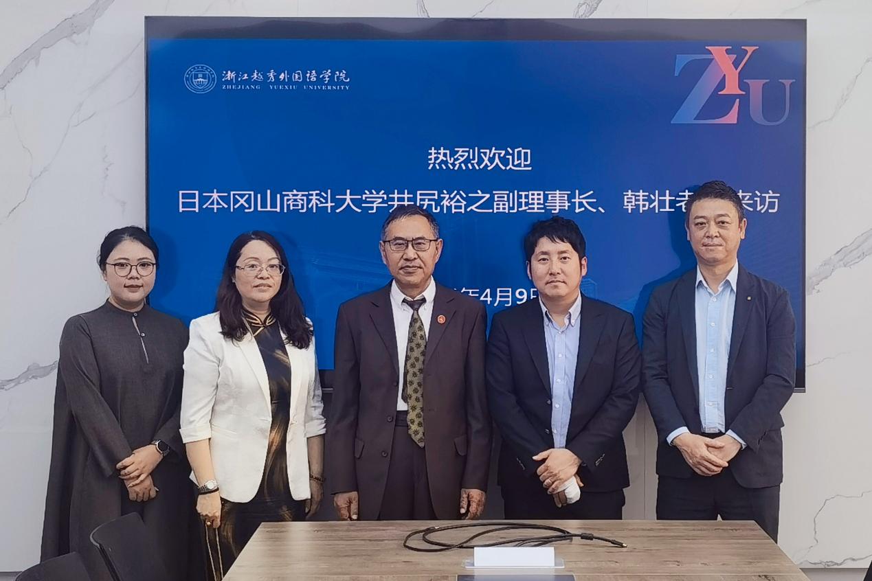 (合影:左起日语系副主任钟一沁老师、东方语言学院副院长胡燕静老师、东方语言学院院长邱鸣教授、日本吉备学园副理事长井尻裕之老师、日本冈山商科大学入试部入试课课长助理韩壮老师)