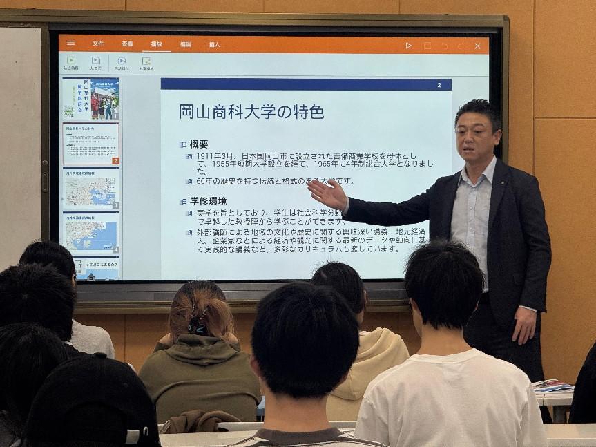 (图2:韩壮老师介绍日本冈山商科大学概况以及国际交流项目)